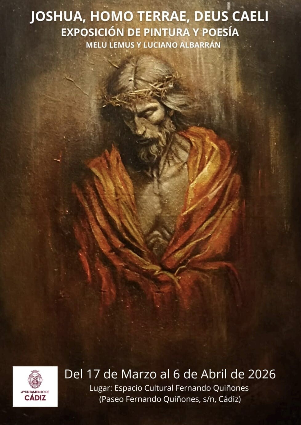 El próximo 17 de marzo se inaugurará la exposición "JOSHUA, HOMO TERRAE, DEUS CAELI" de la pintora Melu Lemus, que contará con la poesía de Luciano Albarrán. Será en el Expacio Cultural Fernando Quiñones de Cádiz